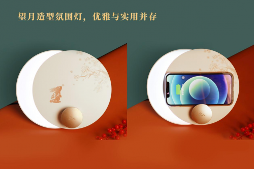 圆盘造型、玉兔望桂定制图案,极具中式文化美学,集无线充电、情调氛围灯、手机支架功能于一身,优雅与实用并存。