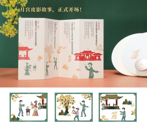 月宫故事折页纸上,印有四幕皮影戏故事脉络,新戏旧戏齐登场,赶紧自导自舞起来!