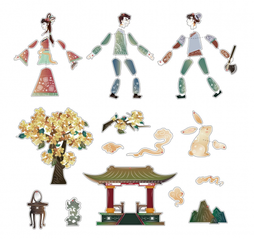 礼盒第二层存放着一套精心制作的皮影戏套装,包含桂树、镜台等月宫布景道具,张管事、嫦娥玉兔、吴刚等形象零部件,用铆钉和实木戏棍联缀各部件,进行皮影戏偶的组装。