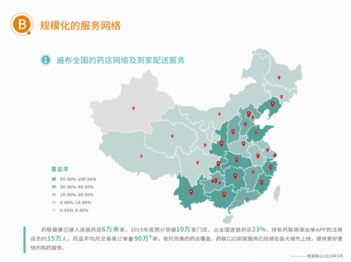 药联健康是国内领先的商业保险在医药零售行业落地运营的技术服务平台,已与国内超过数十家保险公司建立业务合作,和国内近500家连锁建立对接合作,覆盖全国29个省、自治区及直辖市逾6万余家线下门店,为商业保险用户提供到店购药、O2O送药上门的购药服务。