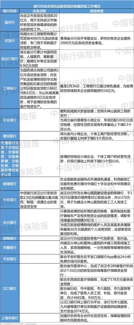 截至28日,中国银行业协会、政策性银行、大型银行、邮储银行(5.670,-0.04, -0.70%)、股份制银行、城商行、农商行及外资银行累计为抗击新型肺炎疫情捐款超过7.7亿元。为响应银行业协会倡议,多家银行开通金融服务绿色通道,安排专项信贷额度,向疫情防控一线的相关单位提供更加优惠的服务,对受疫情影响的医护人员、百姓在信贷政策上予以适当倾斜,通过调整区域融资政策、内部资金转移定价等措施,提升受疫情影响严重地区的金融供给能力。