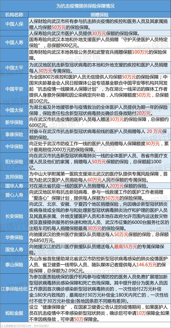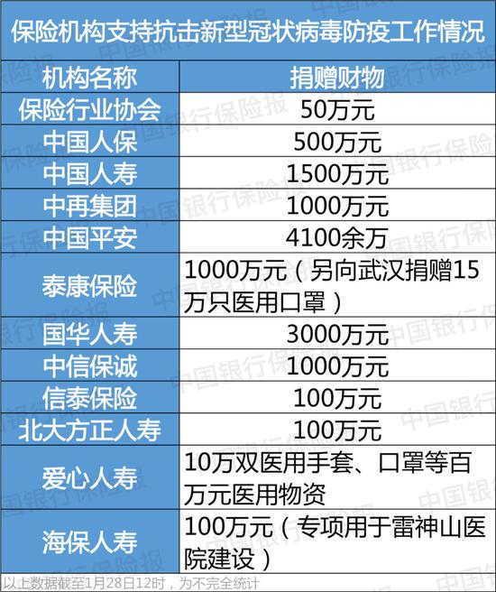 截至28日,保险行业协会、中国人保(7.260, -0.26, -3.46%)、中国人寿(32.260, -1.25, -3.73%)、中再集团、中国平安(83.490, -1.73,-2.03%)、泰康保险、国华人寿、中信保诚、信泰保险、北大方正人寿等保险机构,累计为抗击新型肺炎疫情捐款超过1.2亿元。
